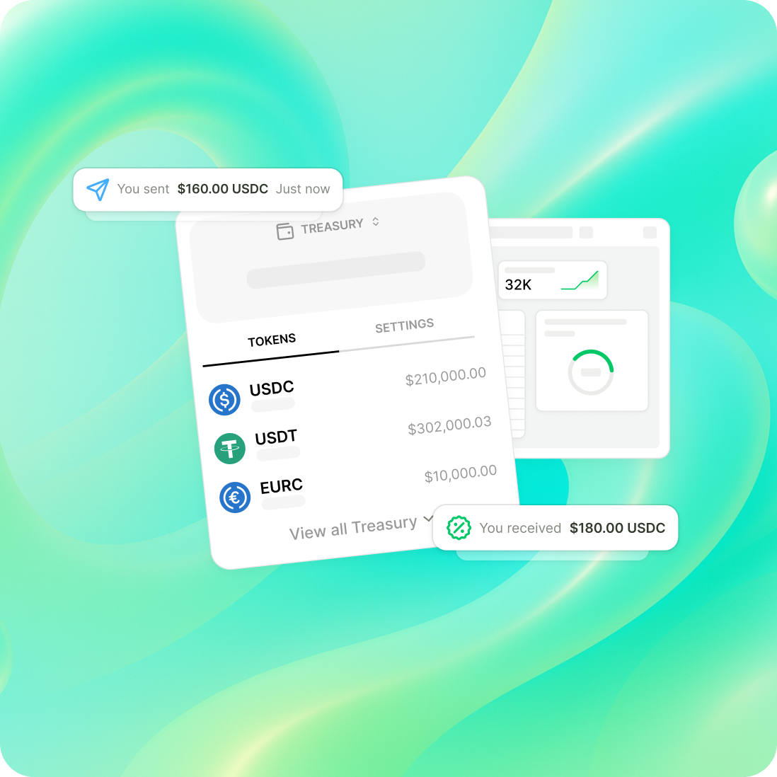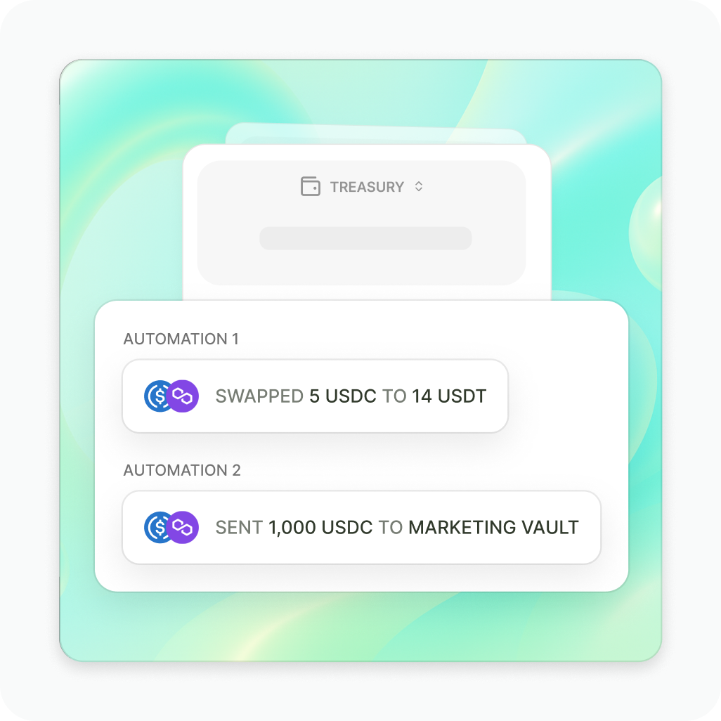 Define spending limits, approval workflows, and multi-sig access to control every treasury operation. Auditable logic that’s embedded on the wallet’s contract vs obscure offchain middleware.